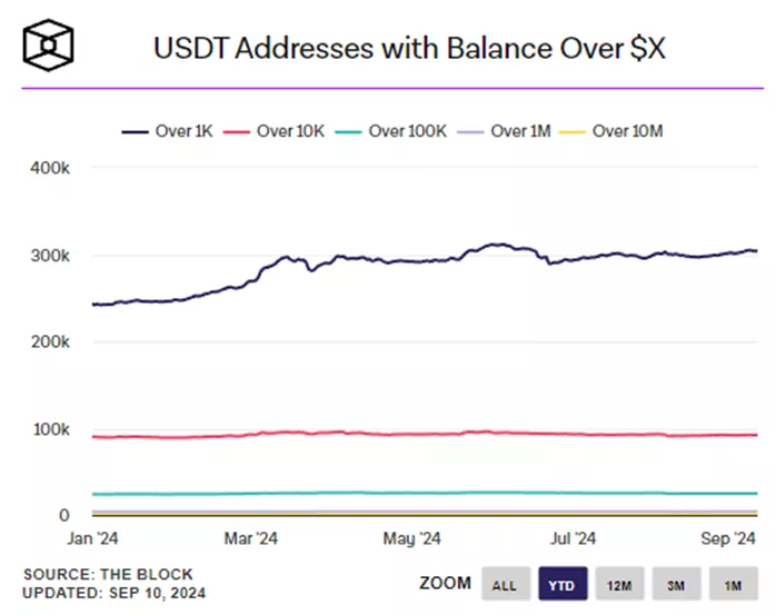Согласно дашбордам The Block, с августа возросло число держателей USDT с балансами $1000-10 000, тогда как количество обладателей более крупных сумм не претерпело значительных изменений.