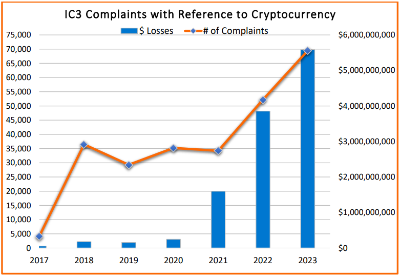 За 2023 год ФБР получило 69 468 жалоб на мошенничество с криптовалютами с совокупным ущербом свыше $5,6 млрд. По сравнению с 2022 годом финансовые потери выросли на 45%.