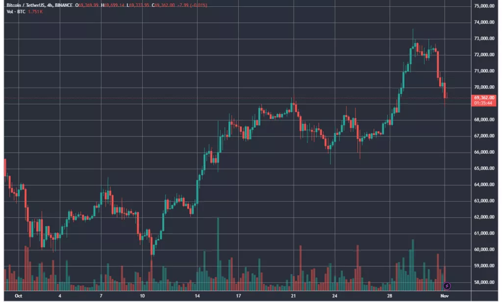 29 октября октября курс биткоина достиг отметки $73 620 (на Binance), вплотную приблизившись к мартовскому историческому максимуму.
