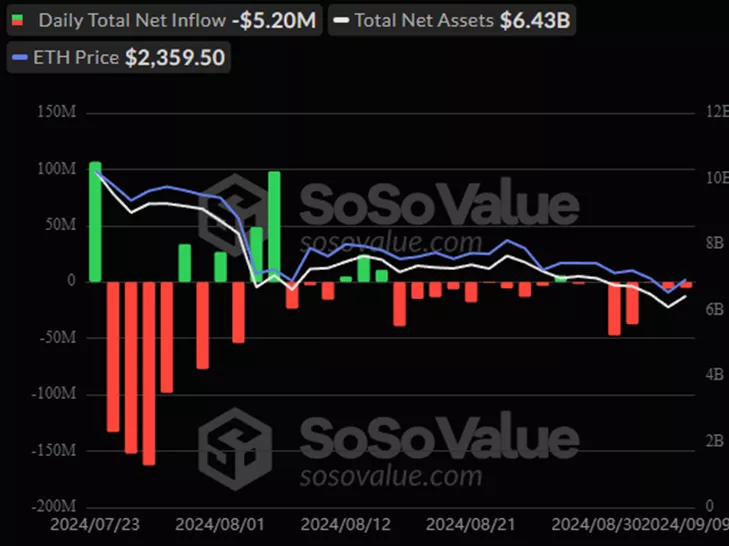 9 сентября отток из спотовых Ethereum-ETF составил $5,2 млн, согласно SoSoValue. Отрицательная динамика продолжилась пятый день подряд.