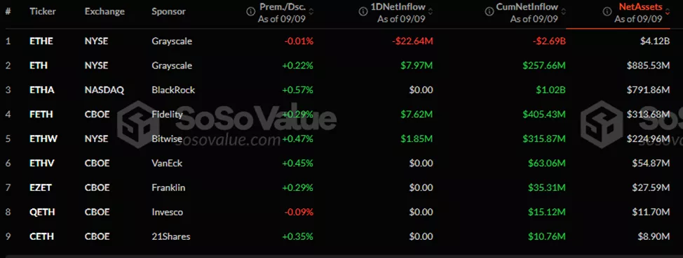 Совокупный отток из Grayscale Ethereum Trust (ETHE) повысился до $2,69 млрд. 9 сентября показатель вырос на $22,6 млн.