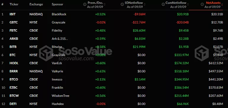 Из GBTC от Grayscale клиенты вывели $22,8 млн, из IBIT от BlackRock — $9,1 млн.