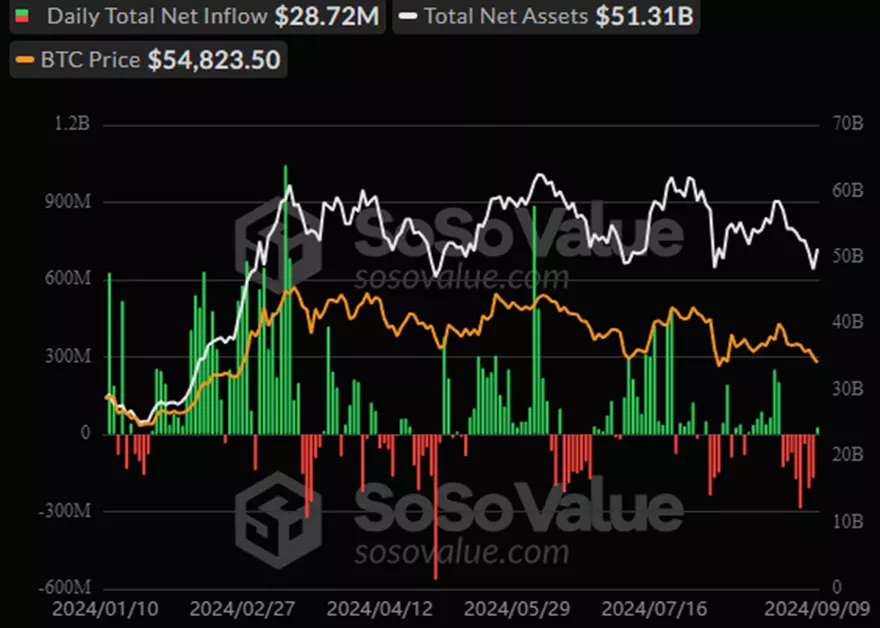 9 сентября поступления в спотовые биткоин-ETF составили $28,7 млн, согласно SoSoValue. В течение предыдущих восьми дней инвесторы вывели из продуктов $1,2 млрд.