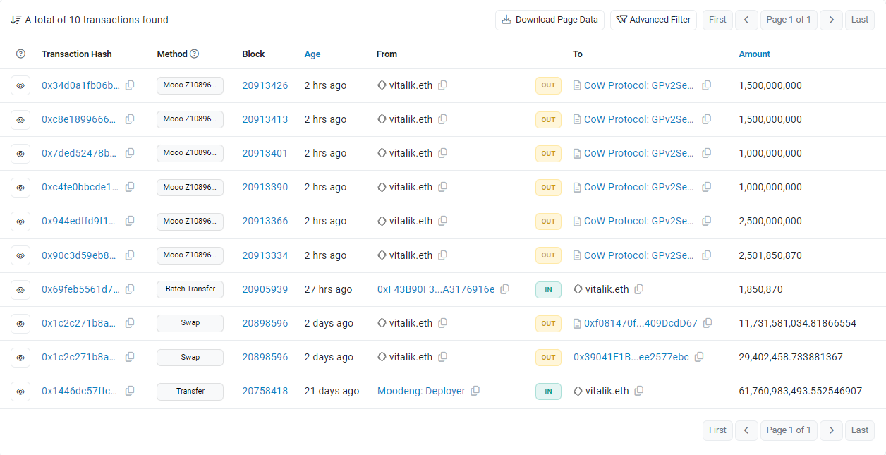 Бутерин продал мем-коины MOODENG и отправил деньги на благотворительность