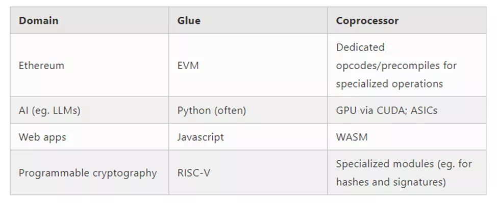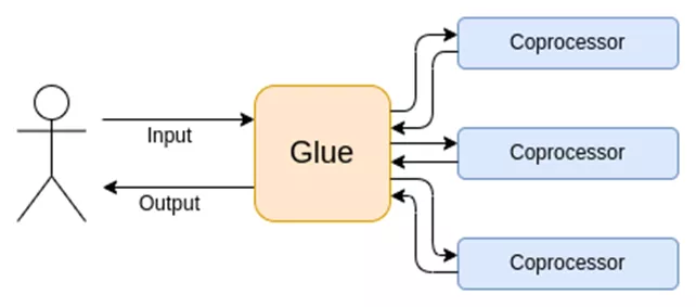 По мнению Бутерина, все чаще встречается архитектура, которую он называет «клей и сопроцессор». В ней есть некий центральный компонент — «клей» — с высокой общностью, но низкой эффективностью, который отвечает за передачу данных между одним или несколькими компонентами сопроцессора. Последний обладает низкой общностью, но высокой эффективностью.