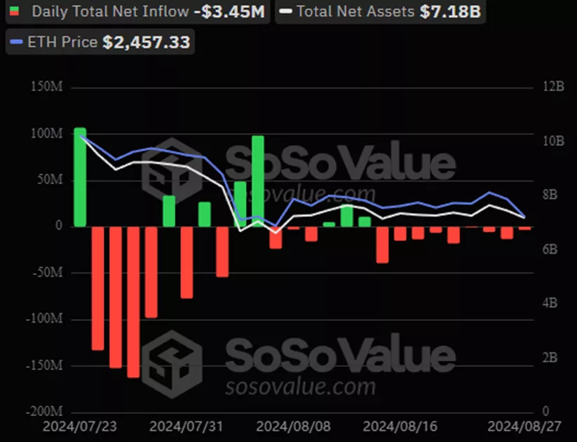 27 августа отток из спотовых Ethereum-ETF составил $3,5 млн, согласно SoSoValue. Отрицательная динамика продолжилась девятый день подряд.