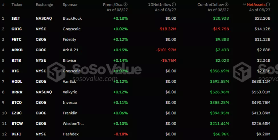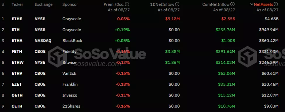 Совокупный отток из Grayscale Ethereum Trust (ETHE) повысился до $2,55 млрд. 27 августа показатель вырос на $9,2 млн.