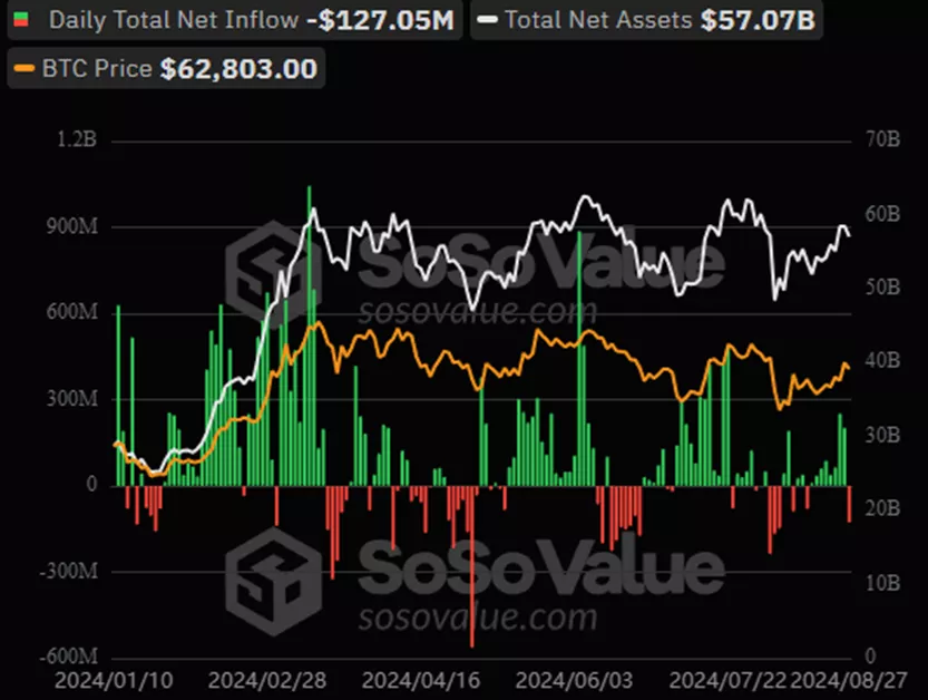 27 августа отток из спотовых биткоин-ETF составил $127,1 млн, согласно SoSoValue. В предыдущие восемь дней в продукты поступило $756 млн.