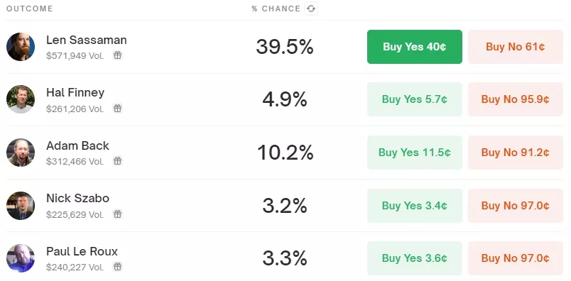 Однако значительная часть пользователей уверена, что Хэтч прав. На децентрализованной платформе прогнозов Polymarket почти 40% участников делают ставку на Сассамана в качестве Сатоши Накамото.