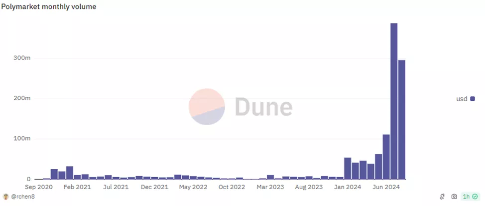 По данным Dune Analytics, объем транзакций на популярной в сети Ethereum платформе предсказаний Polymarket в июле составил $387 млн — больше, чем за любой другой месяц в ее истории. За неполный август показатель уже достиг $295,9 млн.