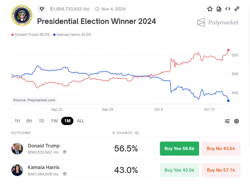 Согласно Polymarket, шансы на подобный исход подскочили до 56,6%. В последний раз столь высокое значение наблюдалось в конце июля.