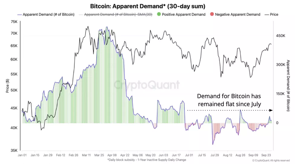 Спрос на биткоин стабилизируется, но в IV квартале для поддержания роста цен требуется усиление метрики. К такому выводу пришли в CryptoQuant, пишет The Block.