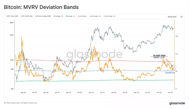 Коэффициент MVRV (2,03) вернулся к своему равновесному показателю (1,72), сигнализируя о затухании ажиотажа после запуска ETF. Исторически эта критическая отметка знаменовала переход между бычьим и медвежьим рынками.