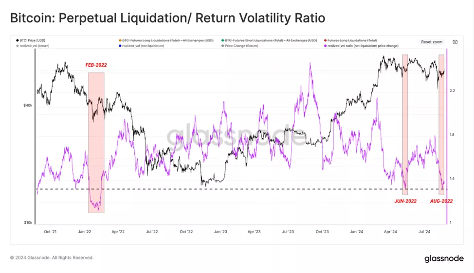 В заключении специалисты рассмотрели ситуацию на рынке бессрочных контрактов. Они обнаружили снижение соотношения стоимости и объема ликвидаций до отметок февраля 2022 года. Это позволило утверждать о значительном ослаблении спекулятивного интереса.