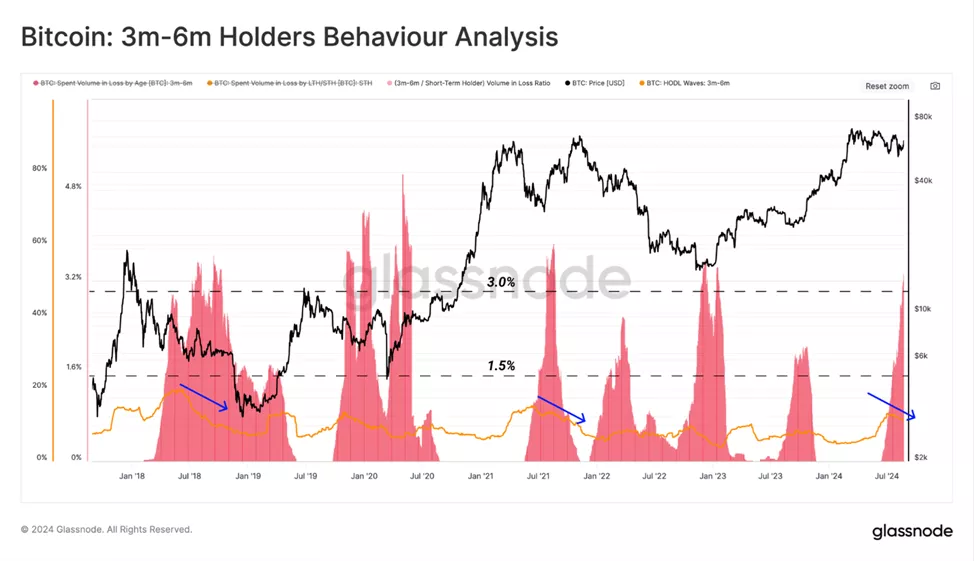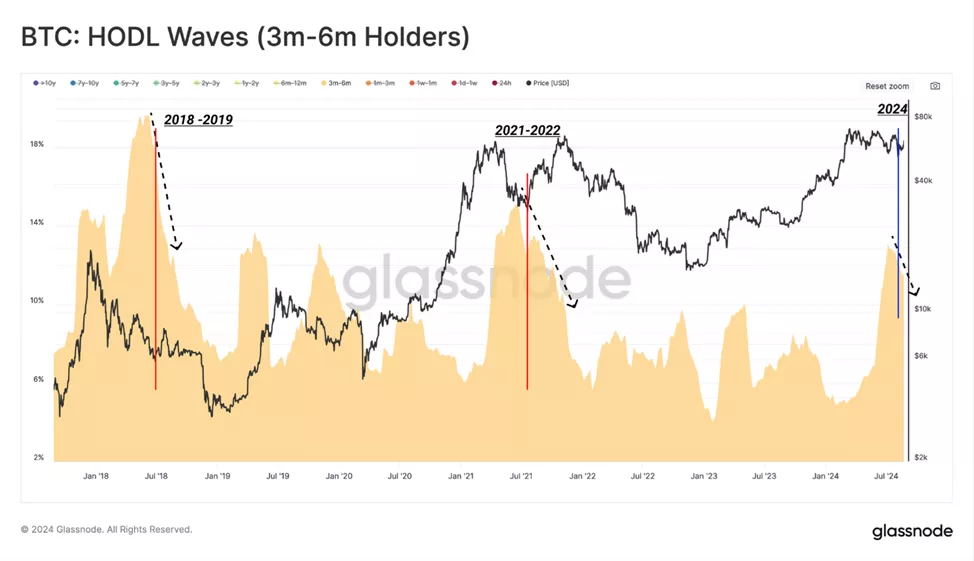 В настоящее время монеты в «возрасте» трех-шести месяцев составляют более 12,5% от общего объема доступного предложения, что демонстрирует сходство с распродажей середины 2021 года и пиком медвежьего рынка 2018 года.