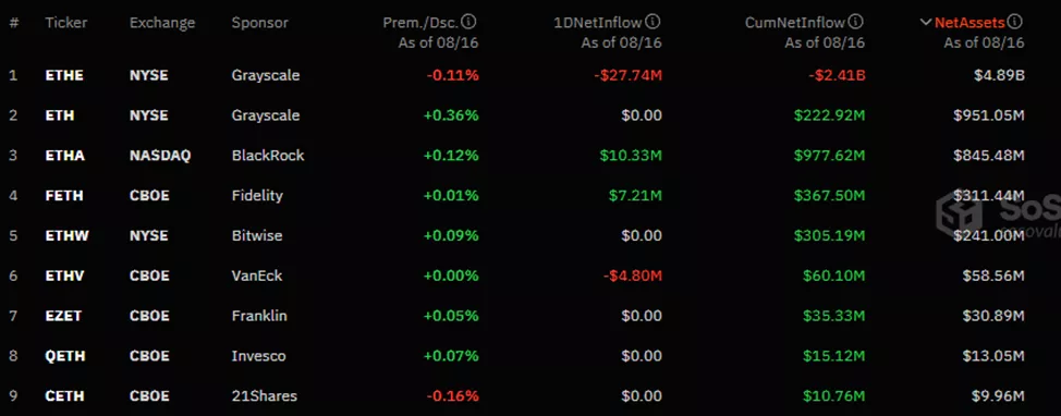 Совокупный отток из Grayscale Ethereum Trust (ETHE) увеличился до $2,41 млрд. 16 августа показатель повысился на $27,7 млн.