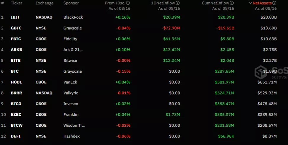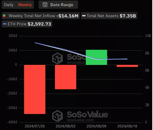C 12 по 16 августа в сегменте спотовых Ethereum-ETF зафиксирован отток средств в размере $14,16 млн против притока в $104,8 млн неделей ранее, согласно SoSoValue.