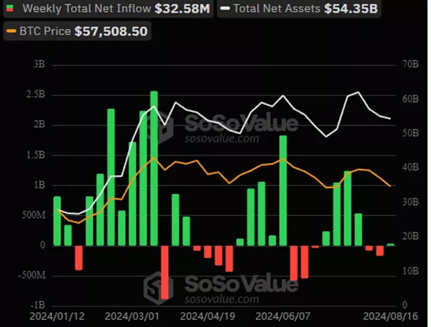 В спотовых биткоин-ETF негативная динамика прервалась. За календарную неделю поступления составили $32,6 млн.