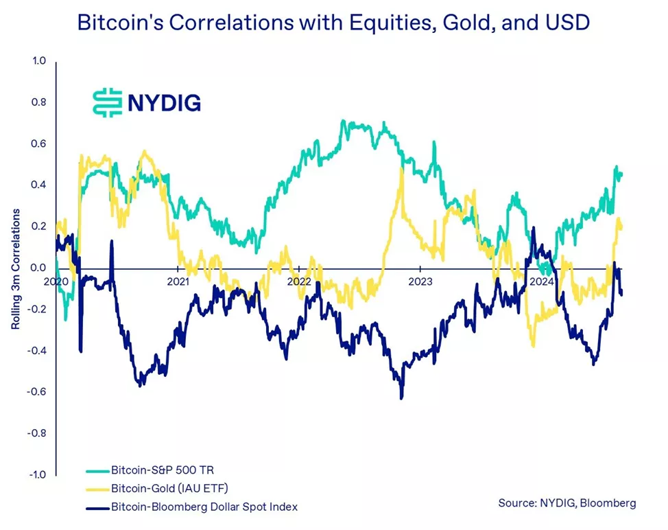 Эксперты отметили возросшую корреляцию цифрового золота с фондовым рынком США. В третьем квартале ценовая взаимосвязь на 90-дневном отрезке достигла 0,46.