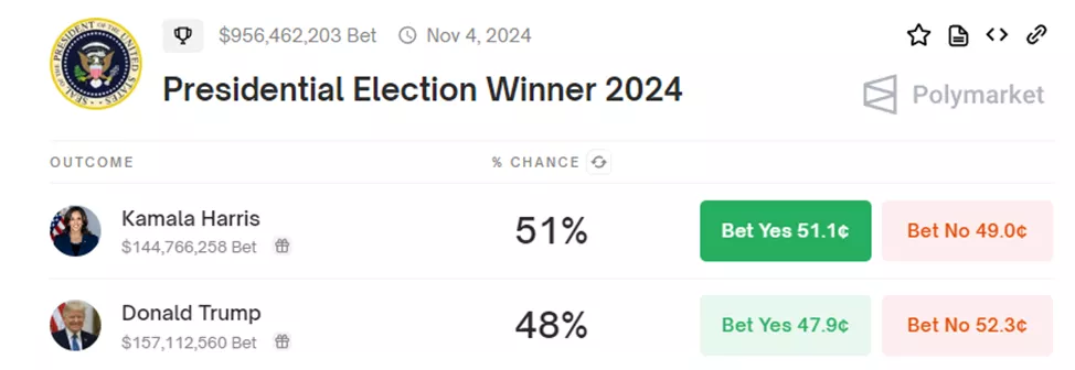 Специалисты подчеркнули улучшение конъюнктуры рынка криптовалют в условиях увеличения шансов на победу Камалы Харрис. Согласно Polymarket, она опережает соперника на 3%.