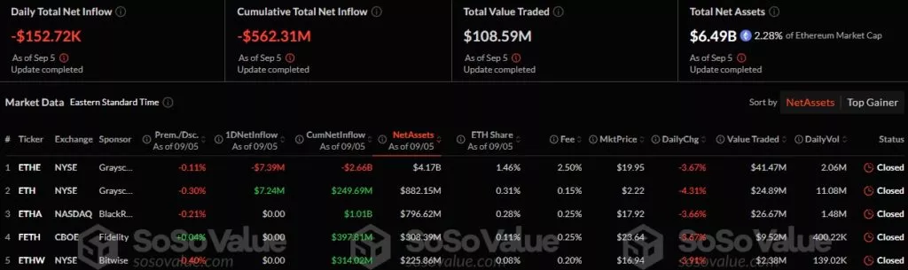 По данным SoSoValue, с начала старта торгов в конце июля к 5 сентября спотовые Ethereum-ETF зафиксировали кумулятивный отток в размере $562,3 млн. Тренд обусловлен выводом средств из продукта Grayscale — общий объем уже достиг $2,66 млрд.