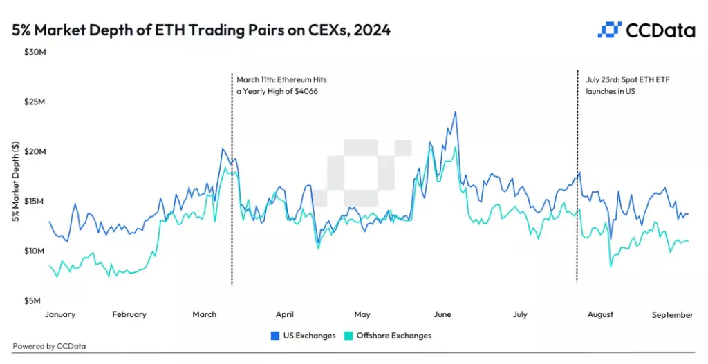 С момента запуска в США спотовых Ethereum-ETF средняя 5% глубина рынка для пар с ETH на внутренних централизованных биржах упала на 20%, до ~$14 млн. Об этом пишет CoinDesk со ссылкой на данные CCData.