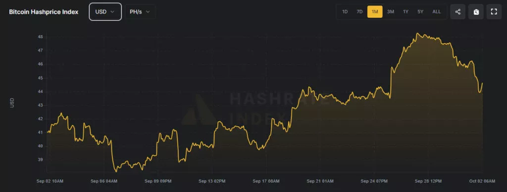 В результате коррекции курса в конце месяца метрика откатилась к значениям в районе $44, что заметно выше зафиксированных в первые недели сентября $38 на PH/s в сутки.