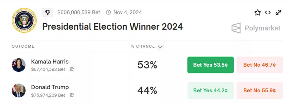 Согласно Polymarket, Харрис опережает соперника от Республиканской партии Дональда Трампа — 53% против 44%. Объем ставок на исход президентских выборов приблизился к $606 млн.