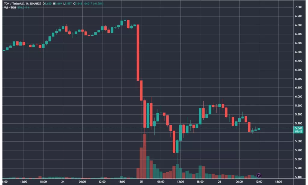 Котировки токена TON поддерживаемого Дуровым проекта The Open Network после его задержания обвалились с уровня около $6,8 до $5,2 в моменте. Цена монеты стабилизировалась на отметках вблизи $5,65, за 24 часа курс вырос на 0,4% (CoinGecko).