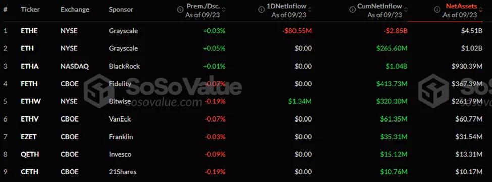 Совокупный отток из Grayscale Ethereum Trust (ETHE) повысился до $2,85 млрд. 23 сентября показатель вырос на максимальные с 31 июля $80,6 млн.