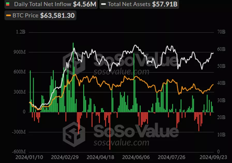 23 сентября поступления в спотовые биткоин-ETF составили $4,6 млн, согласно SoSoValue. Положительная динамика продолжилась третий день подряд.