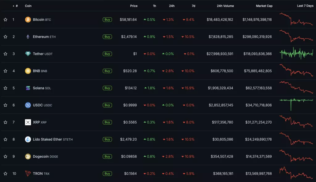 Все цифровые активы из топ-10 по капитализации завершили неделю в «красной зоне». Больше других потеряла Solana (-15,9%).