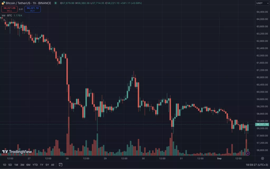Первая криптовалюта начала неделю на уровне $64 000. В среду, 28 августа, цифровое золото провалило психологический рубеж в $60 000, после чего лишь на время смогло восстановить позиции.