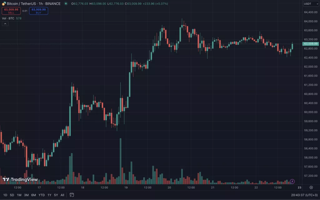 Первая криптовалюта начала неделю на уровне $60 000. Во вторник, 17 сентября, цифровое золото протестировало отметку $61 000. В четверг, 19 сентября, актив превысил $63 000.