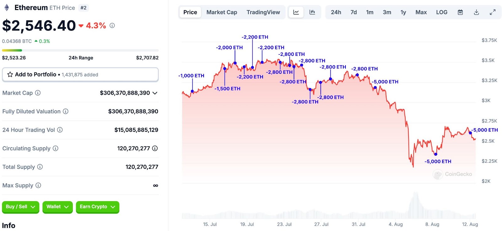 После этого пользователь периодически отправлял тысячи монет. На адресе осталось еще 15 600 ETH ($41,8 млн).