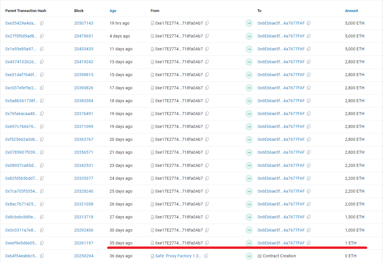 Первая транзакция на 1 ETH с упоминаемого адреса зафиксирована 35 дней назад. Вероятно, это тестовый перевод для проверки адреса.