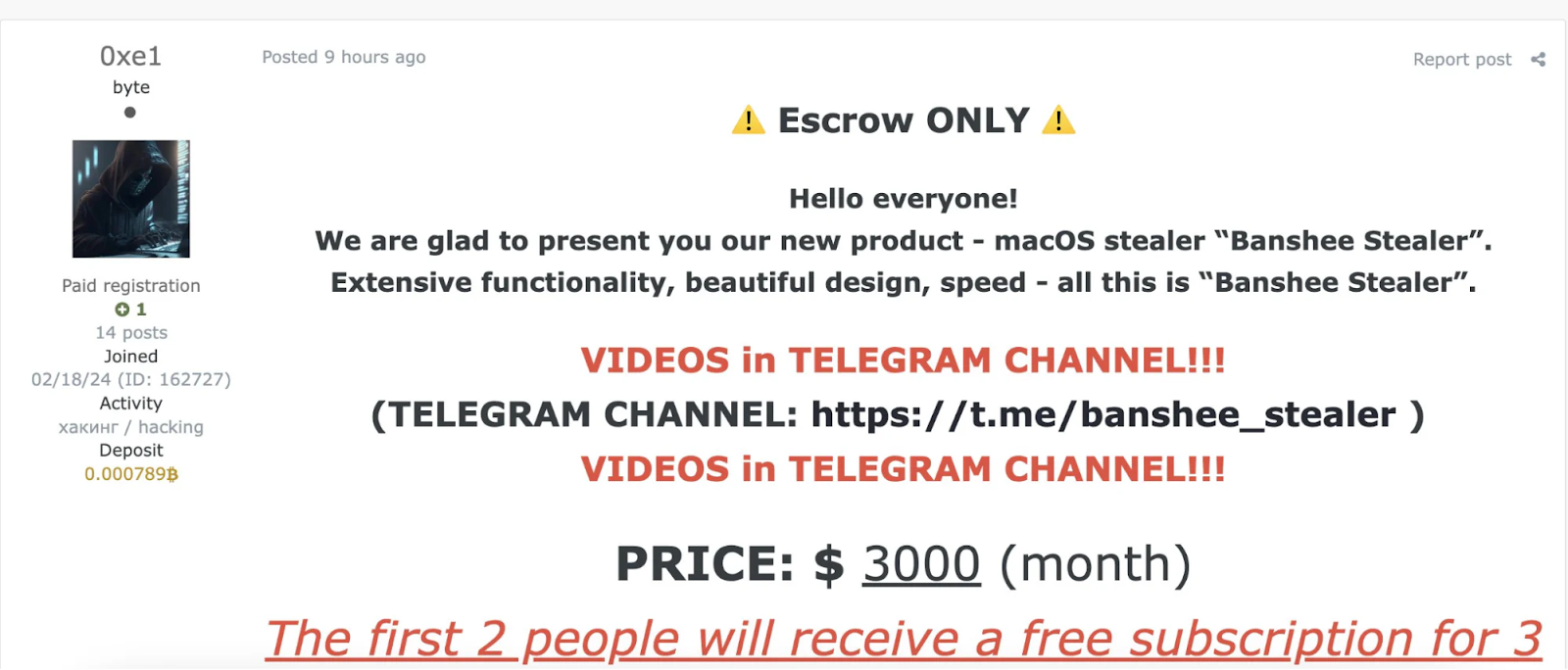 Инфостилер реализуется в даркнете по цене $3000 за месяц использования.