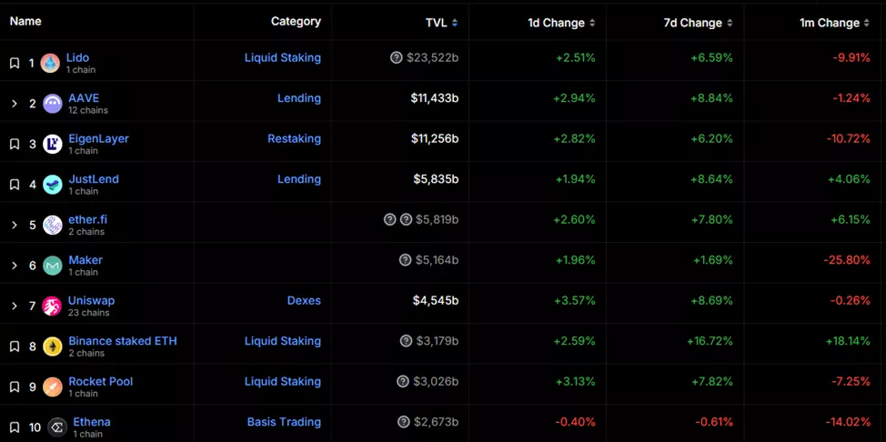 Общий объем заблокированной стоимости (TVL) в DeFi-протоколах обвалился до $81,9 млрд. Лидером остается Lido с показателем $23,5 млрд. На вторую строчку после длительного перерыва вернулась Aave ($11,4 млрд), сместив с нее EigenLayer ($11,3 млрд).