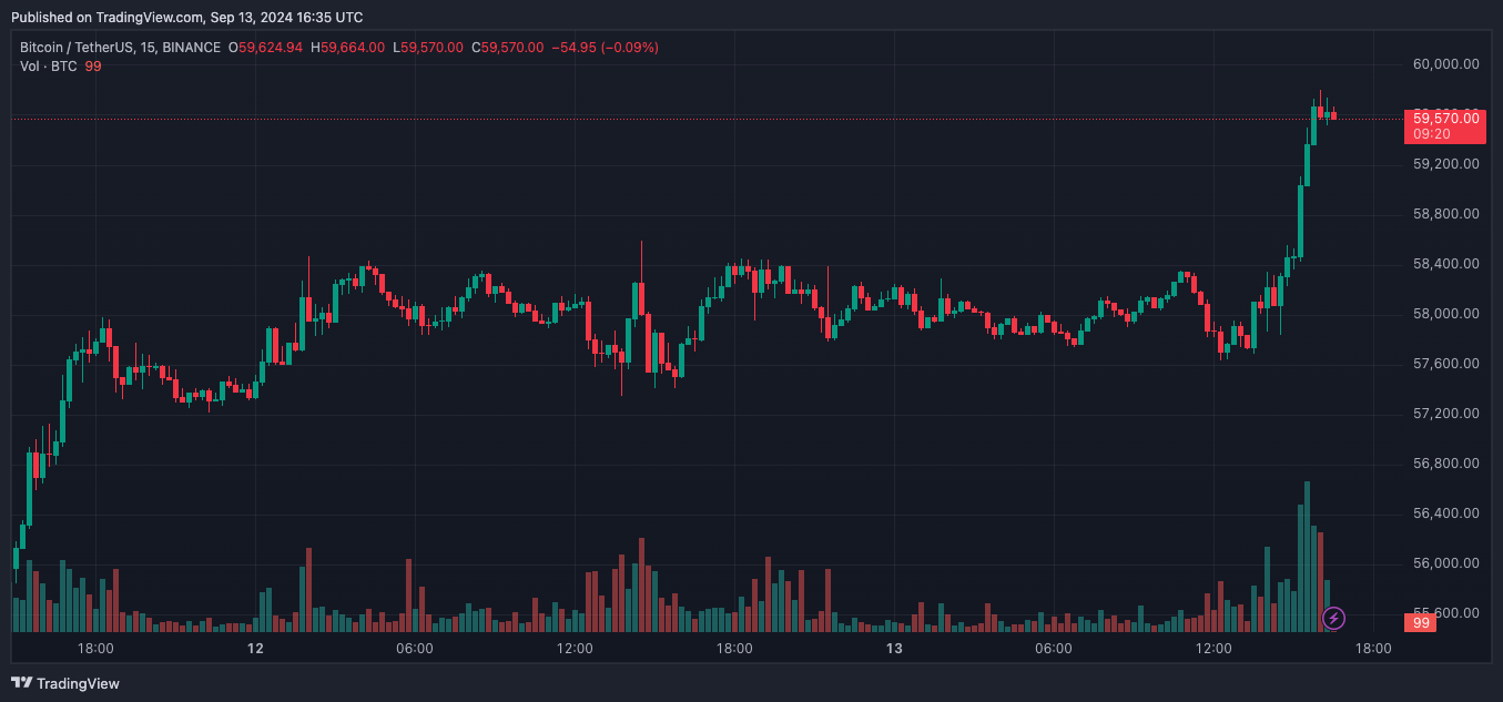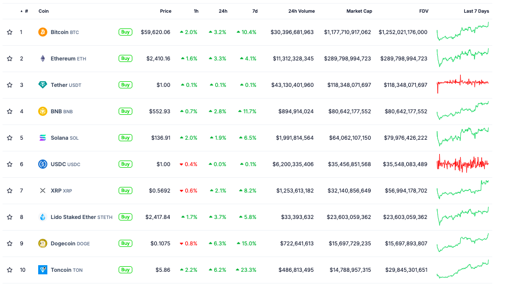 Примерно в 18:00 (Киев/МСК) первая криптовалюта продемонстрировала быстрый рост, приблизившись к $60 000. За сутки актив подорожал на 3,2%.