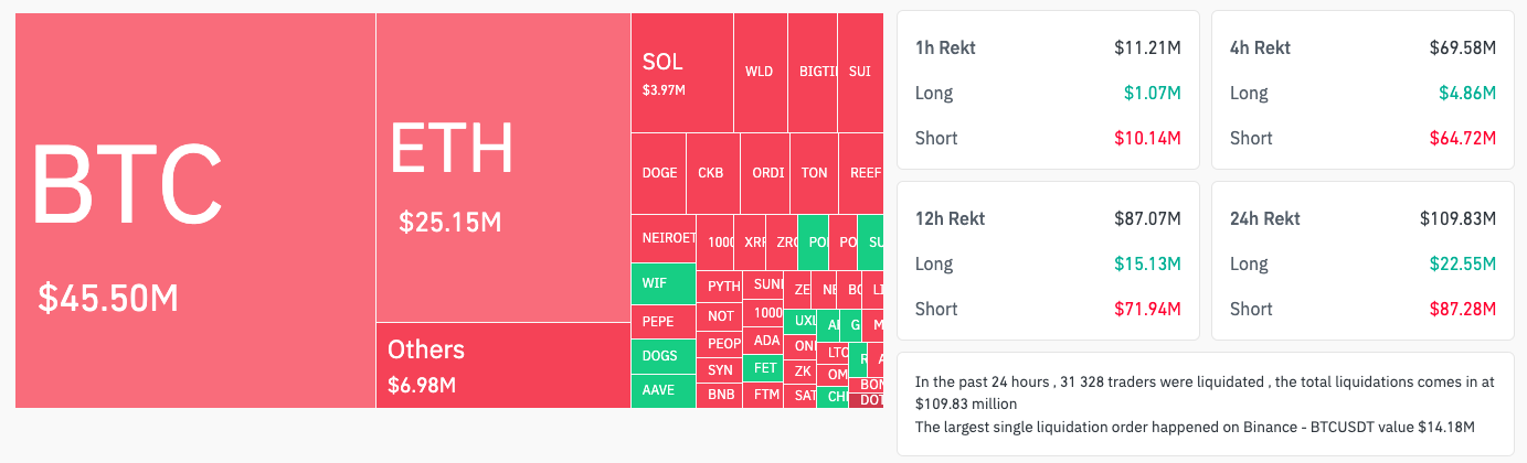 Согласно Coinglass, за прошедшие 24 часа объем ликвидаций достиг $109,5 млн. Большая часть ($87 млн) пришлась на короткие позиции.