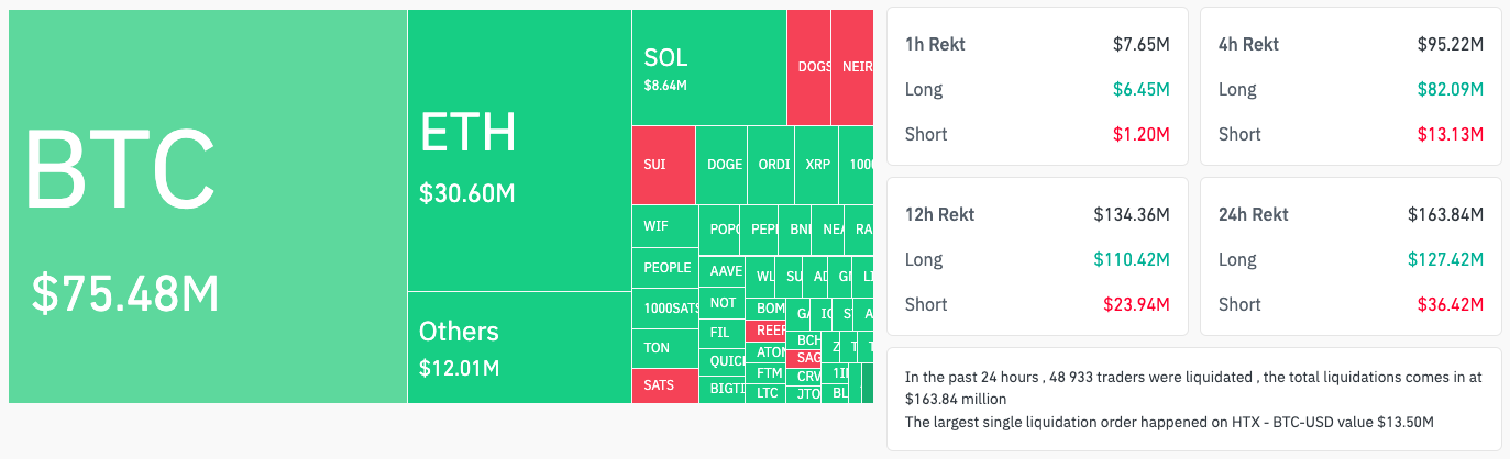 Согласно Coinglass, объем ликвидаций за прошедшие 24 часа достиг $163,8 млн. Большая часть ($127,4 млн) пришлась на лонги.