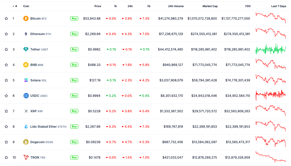 Биткоин потянул за собой в «красную зону» другие цифровые активы из топ-10 по капитализации. Ethereum просел до $2270, на 4% за сутки.