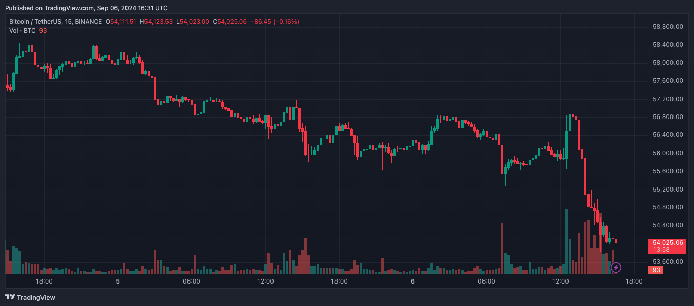 6 сентября примерно с 13:00 (Киев/МСК) котировки первой криптовалюты начали снижаться, рухнув с $56 000 до $54 000 — на 3,5%.