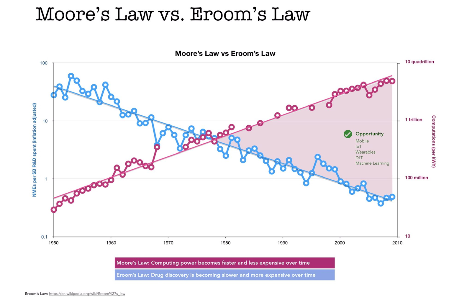 «Закон Эрума» демонстрирует противоположный эффект: стоимость разработки новых лекарств удваивается каждые девять лет.