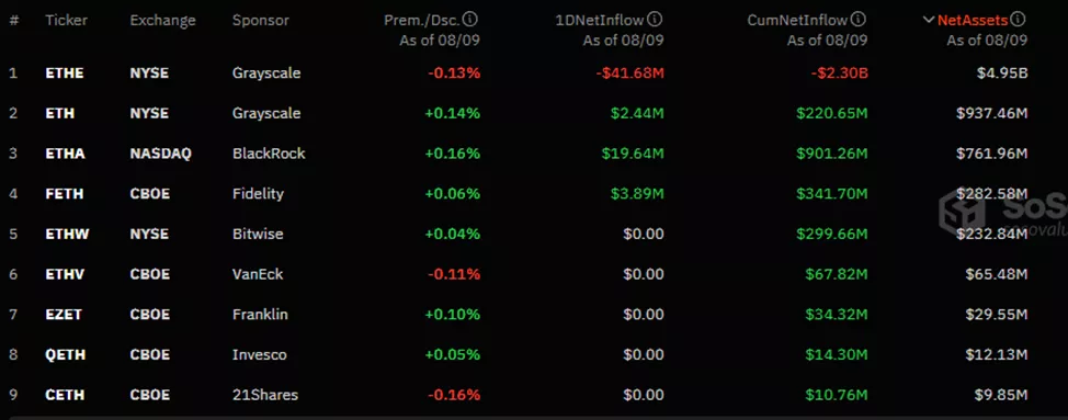 Совокупный вывод средств из Grayscale Ethereum Trust (ETHE) увеличился до $2,3 млрд. 9 августа показатель повысился на $41,7 млн.