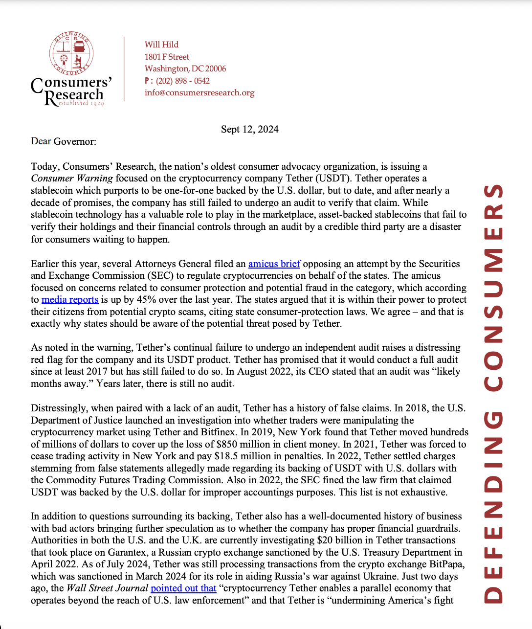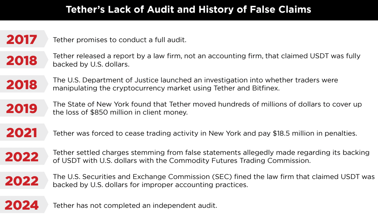 Заявления группы сопровождались открытым письмом в адрес губернаторов всех штатов США. В нем они упомянули присужденные Tether штрафы за ложные заявления о полном обеспечении USDT, «хорошо задокументированную историю» ведения бизнеса с недобросовестными участниками рынка, а также неспособность компании предотвратить использование ее стейблкоина для обхода международных санкций.