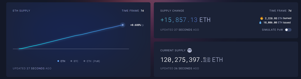 За последние семь дней параметр увеличился на 18 086,4 ETH, из которых 2229,6 ETH выведено из обращения через механизм сжигания в рамках EIP-1559. Чистая эмиссия составила 15 856,9 ETH. Годовая инфляция возросла до 0,69%.