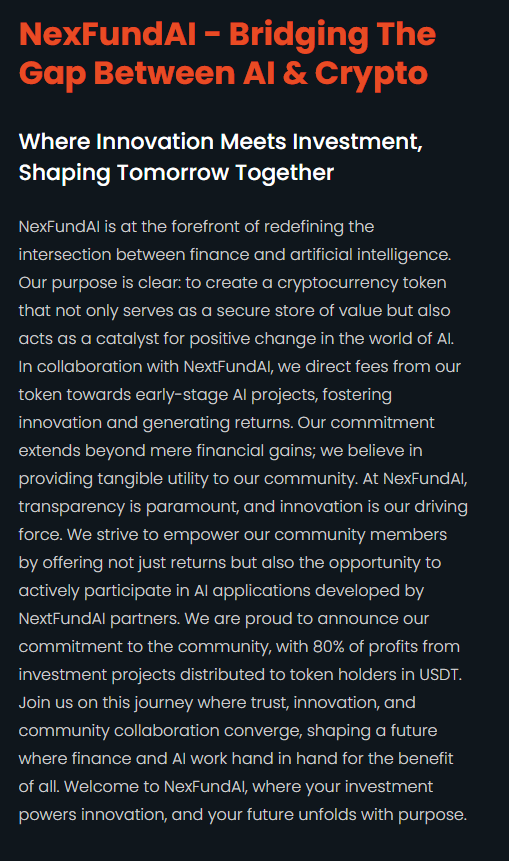NextFundAI позиционировался как токен, который «направлял сборы в ИИ-проекты на ранней стадии, стимулируя инновации и принося прибыль». 80% поступлений от инвестиций обещали распределять среди держателей актива в USDT.