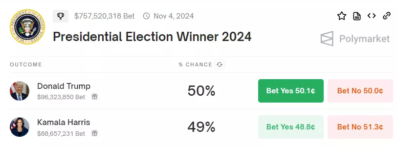 Согласно Polymarket, кандидатка на этот пост от Демократической партии Камала Харрис уступает сопернику от Республиканской партии Дональда Трампа — 49% против 50%. Объем ставок на исход приблизился к $757,6 млн.