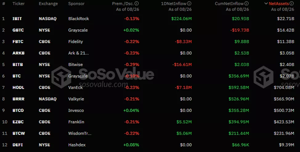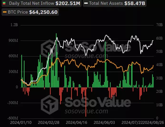 26 августа притоки в спотовые биткоин-ETF составили $202,5 млн, согласно SoSoValue. Показатель за последние восемь дней составил $756 млн.